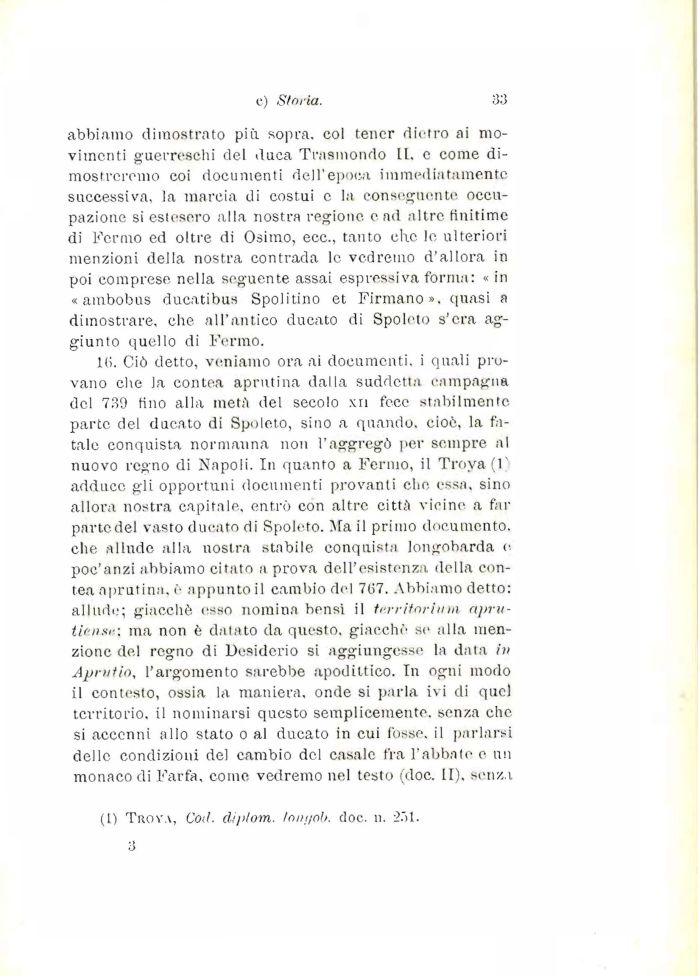 Hi. Ciò detto, veniamo ora ai documenti, i quali provano che la contea aprutina dalla suddetta campagna del 739 fino alla meta del secolo xn fece stabilmente parte del ducato di Spoleto, sino a quando, cioò, la fatale conquista normanna non l'aggregò per sempre al nuovo regno di Napoli. In quanto a Fermo, il Trova (f adduce gli opportuni documenti provanti che essa, sino allora nostra capitale, entrò con altre città vicine a far partcdel vasto ducato di Spoleto. Ma il primo documento, che allude alla nostra stabile conquista longobarda e poc'anzi abbiamo citato a prova dell'esistenza della contea aprutina, è appunto il cambio del 7(57. Abbiamo detto: alludi;; giacché esso nomina bensì il tr.rritnrinm apru-ticnsr.; ma non è datato da questo, giacché se alla menzione del regno di Desiderio si aggiungesse la data in Aprii fio, l'argomento sarebbe apodittico. In ogni modo il contesto, ossia la maniera, onde si parla ivi di quel territorio, il nominarsi questo semplicemente, senza che si accenni allo stato o al ducato in cui fosse, il parlarsi delle condizioni del cambio del casale fra l'abbate e un monaco di Farfa, come vedremo nel testo (doc. II), senza