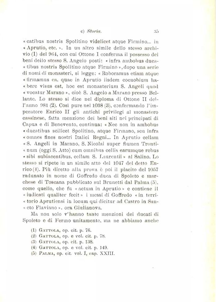 « catibus nostris Spolitino videlicet atque Firmino... in «Aprutio, etc. ». In un altro simile dello stesso archivio (.1) del OC.i, con cui Ottone I conferma il possesso dei beni dello stesso S. Angelo posti: « infra ambobus duca-« tjbus nostris Spolitino atque Firmino »,dopo una serie di nomi di monasteri, si legge: « Roboramus etiam atque « ilnnamus ea, quae in Aprutio iisdem coeuobium ha-« bere visus est, hoc est monasteriuni S. Angeli quod « vocatur Marano », cioè S. Angelo a Marano presso Bollante. Lo stesso si dice nel diploma di Ottone II dell'anno 081 (2). Così pure nel 1038(3), confermando l'imperatore Enrico II gli antichi privilegi al monastero cassinese, fatta menzione dei beni siti noi principati di Capua e di Benevento, continua: « Nec non in ambobus «duentibus scilicet Spolitino, atque Firmano, seu infra « omnes fìnes nostri Italici Regni... In Aprutio cellam « S. Angeli in Marano, S.Nicolai super flumcn Tronti-« num (oggi S. Atto) cu in omnibus cellis earumque rebus « sibi subin.ccntibus, cellam S. Laureatii » al Salino. Lo stesso si ripete in un simile atto del 1047 del detto Enrico (I). Più diretto alla prova è poi il placito del 1057 radunato in nome di Goffredo duca di Spoleto e marchese di Toscana pubblicato sul Brunetti dal Palma (5\ come quello, che fu «actuin in Aprutio» e contiene il « iudicati qualiter feeit » i messi di Goffredo «in terri-« torio Aprutiensi in locum qui dicitur ad Castro in San-« cto Fiaviano ». ora Giulianova.