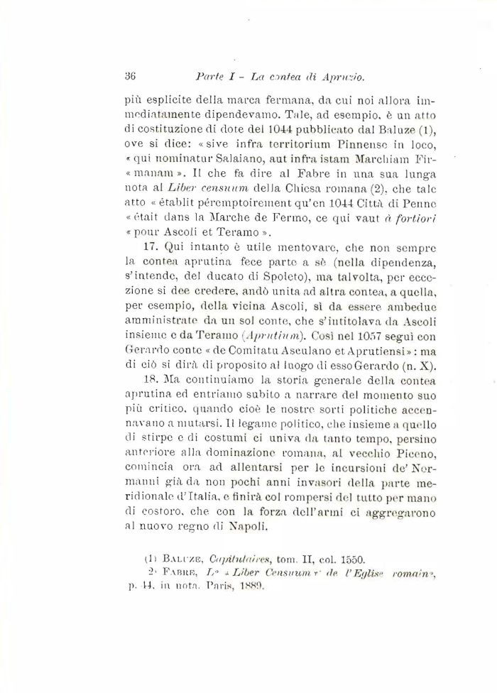 più esplicite della marca fermana, da cui noi allora immediatamente dipendevamo. Tale, ad esempio, è un atto di costituzione di dote del 1044 pubblicato dal Baluze (1), ove si dice: «sive. infra territorium Pinnenso in loco, «qui nominatili' Salaiano, aut infra istam Marchiani Fir-« manam ». Il che fa dire al Fabre in una sua lunga nota al Libar censitimi della Chiesa romana (2), che tale atto «établit péremptoirement qu'cn 1044 Città di Penne «était dans la Marche de Fermo, ce qui vaut à fortiori « pour Ascoli et Teramo ».
