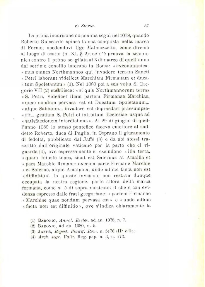 La prima incursione normanna seguì nel 1078, quando Roberto Guiscardo spinse la sua conquista nella marca di Fermo, spedendovi Ugo Malmozzetto, come diremo al luogo di costui (n. XI, § 2); ce n'ò pruova la scomunica contro il primo scagliata ai 3 ili marzo di quell'anno dal settimo concilio laterano in Roma: « excommuuica-« mus omnes Northmannos qui invadere terram Saucti « Petri laborant videlicet Marchiani Firmauam et duca-« tum Spoletanum » (1). Nel 1080 poi a sua volla S. Gregorio VII (2) stabilisce: «si quis Northinannorum terras « S. Petri, videlicet illam partem Firmanae Marchiae, « quac ìiouduin pervasa est et Dueatuui ópoletanuni... « atque Sabinum... invadere vel depraedari praesumpsc-« rit... gratiam S. Petri et introitimi Ecclesiae usque ad « satisfactiouem interdicimus ». Ai 29 di giugno di quell'anno 1080 lo stesso pontefice faceva emettere al suddetto Roberto, duca di Puglia, in Coprano il giuramento di fedeltà, pubblicato dal Jaffé (3) e da noi stessi trascritto dall'originale vaticano per la parte che ci riguarda (4), ove espressamente si escludono « illa terra, « quam iniuste tenes, sieut est Salcnius at Amalfia et «pars Marchio firmane: excepta parte Firmane Marcine «et Salerno, atque Amalphia, unde adhuc facta non est « diftinitio ». In queste invasioni non restava dunque occupata la nostra regione, parte allora della marca fermana, come si è di sopra mostrato; il che ò con evidenza espresso dalle frasi gregoriane: « partem Firmanae « Marchiae quae nondum pervasa est » c « unde adhuc «facta non est diffiuitio», ove s'indica chiaramente la
