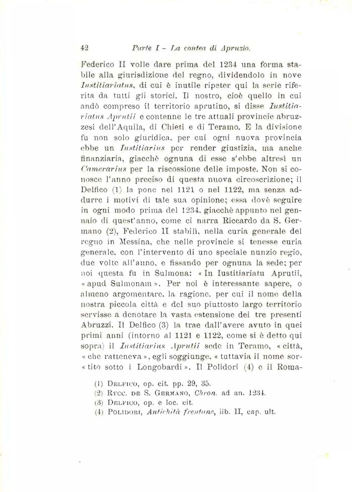 Federico II volle dare prima del 1234 una forma stabile alla giurisdizione del regno, dividendolo in nove Instit/ariatìis, di cui è inutile ripeter qui la serie riferita da tutti gli storici. Il nostro, cioè quello in cui andò compreso il territorio aprutino, si disse Ivstitia-riatiis Apratiì e contenne le tre attuali provincie abruzzesi dell'Aquila, di Ohieti e di Teramo. E la divisione fu non solo giuridica, per cui ogni nuova provincia ebbe un Tuxtitìariiis per render giustizia, ma anche finanziaria, giacché ognuna di esse s'ebbe altresì un f'amnrarius per la riscossione delle imposte. Non si conosce l'anno preciso di questa nuova circoscrizione; il Bellico (1) la pone nel 1121 o nel 1122, ma senza addurre i motivi di tale sua opinione; essa dovè seguire in ogni modo prima del 1234, giacché appunto nel gennaio eli quest'anno, come ci narra Riccardo da S. Germano (2), Federico li stabilì, nella curia generale del regno in Messina, che nelle provincie si tenesse curia generale, con l'intervento di uno speciale nunzio regio, due volte all'anno, e fissando per ognuna la sede; per noi questa fu in Sulmona: « In Iustitiariatn Aprutii, « apud Sulmonam». Per noi è interessante sapere, o almeno argomentare, la ragione, per cui il nome, della nostra piccola citta e del suo piuttosto largo territorio servisse a denotare la vasta estensione dei tre presenti Abruzzi. Il Delfico (3) la trae dall'avere avuto in quei primi anni (intorno al 1121 e 1122, come si è detto qui soprai il luxtitiarius Aprutii sede in Teramo, «città, « che ratteneva », egli soggiunge. « tuttavia il nome sor-« tito sotto i Longobardi». Il Polidori (4) e il Roma-