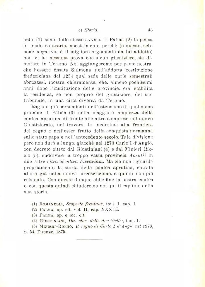 nelIi (1) sono dello stesso avviso. Il Palma (2) la pensa in modo contrario, specialmente perchè (e questo, sebbene negativo, è il migliore argomento da lui addotto) non vi ha nessuna prova che alcun giustiziere, sia dimorato in Teramo Noi aggiungeremo per parte nostra, che l'essere fissata Sulmona nell'addotta costituzione f'redericiana del 1234 qual sede delle curie semestrali abruzzesi, mostra chiaramente, che, almeno pochissimi anni dopo l'instituzione delle provincie, era stabilita la residenza, se non proprio del giustiziere, del suo tribunale, in una città diversa da Teramo.
