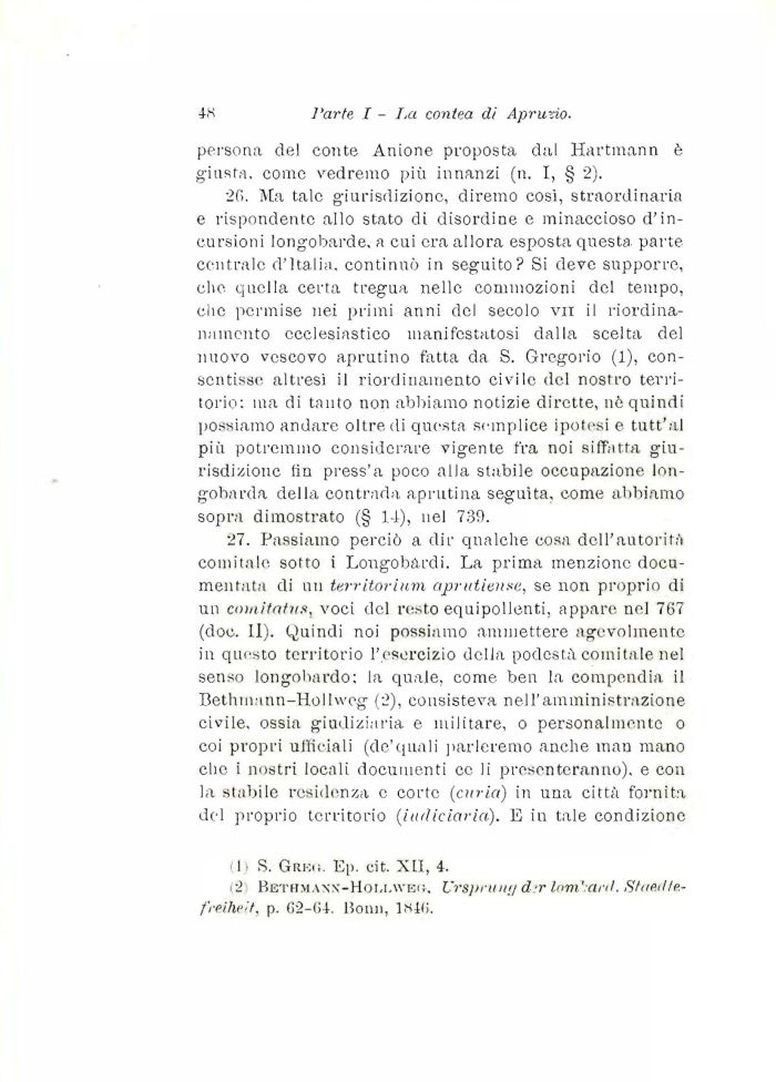 26. Ma tale giurisdizione, diremo cosi, straordinaria e rispondente allo stato di disordine e minaccioso d'incursioni longobarde, a cui era allora esposta questa parte centrale d'Italia, continuò in seguito? Si deve supporre, che quella certa tregua nelle commozioni del tempo, clic permise nei primi anni del secolo vii il riordina-nainento ecclesiastico manifestatosi dalla scelta del nuovo vescovo aprutino fatta da S. Gregorio (1), consentisse altresì il riordinamento civile del nostro territorio: ma di tanto non abbiamo notizie dirette, nò quindi possiamo andare oltre di questa semplice ipotesi e tutt'al più potremmo considerare vigente fra noi siffatta giurisdizione fin press'a poco alla stabile occupazione longobarda della contrada aprutina seguita, come abbiamo sopra dimostrato (§ 14), nel 739.