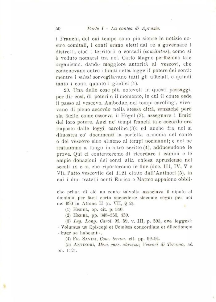 2'.). Tina delle cose più notevoli in questi passaggi, per dir cosi, di poteri è il momento, in cui il conte cede il passo al vescovo. Ambedue, nei tempi carolingi, vivevano eli pieno accordo nella stessa città, senzachè però sia facile, come osserva il Hegel (2), assegnare i limiti del loro potere. Anzi ne' tempi franchi tale accordo era imposto dalle leggi carolino (3); ed anche fra noi si dimostra co' documenti la perfetta armonia del conte e del vescovo sino almeno ai tempi normanni; e noi ne trattammo a lungo in altro scritto (4), adducendone le prove. Qui ci contenteremo di ricordare i cambii e le ampie donazioni dei conti alla chiesa apruziensc nei secoli i.v e x, che riporteremo in fine (doc. Ili, IV, V e VI), l'atto vescovile del 1121 citato dall'Antinori (ó), in cui i due fratelli conti Enrico e Matteo appaiono obbli-