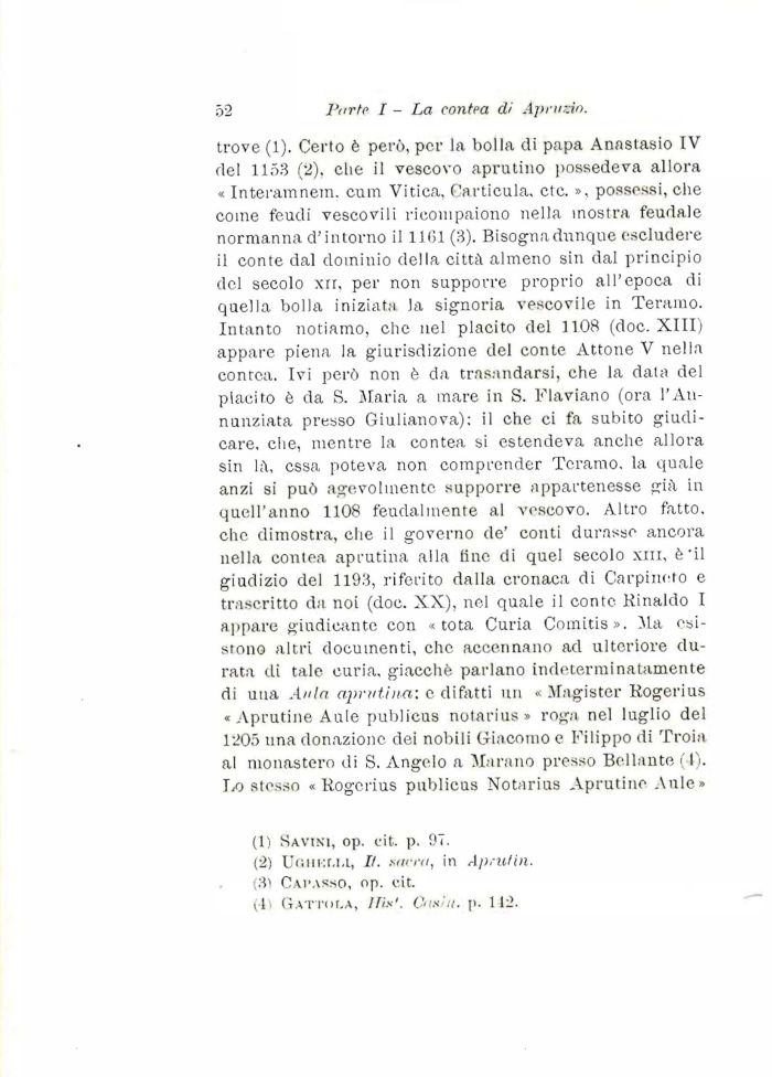 trove (1). Certo è però, per la bolla di papa Anastasio IV del 1153 (SJ), che il vescovo aprutino possedeva allora « Interamnein. cum Vitica, Carticula, ctc. », possessi, che come feudi vescovili ricompaiono nella mostra feudale normanna d'intorno il 1161 (3). Bisogna dunque escludere il conte dal dominio della città almeno sin dal principio del secolo xrr, per non supporre proprio all'epoca di quella bolla iniziata la signoria vescovile in Teramo. Intanto notiamo, clic nel placito del 1108 (doc. XIII) appare piena la giurisdizione del conte Attone V nella contea. Ivi però non è da trasandarsi, che la data del placito è da S. Ilaria a mare in S. Flaviano (ora l'Annunziata presso Giulianova): il che ci fa subito giudicare, che, mentre la contea si estendeva anche allora sin là, essa poteva non comprender Teramo, la quale anzi si può agevolmente supporre appartenesse già in quell'anno 1108 feudalmente al vescovo. Altro fatto, che dimostra, che il governo de' conti durasse ancora nella contea aprutina alla fine di quel secolo xin, è'il giudizio del 1193, riferito dalla cronaca di Carpineto e trascritto da noi (doc. XX), nel quale il contc Rinaldo I appare giudicante con «tota Curia Comitis». -Ala esistono altri documenti, che accennano ad ulteriore durata di tale curia, giacché parlano indeterminatamente di una Aula aprutina: e difatti un « Magister Rogerius « Aprutine Aule publicus notarius » roga nel luglio del 1205 una donazione dei nobili Giacomo e Filippo di Troia al monastero di S. Angelo a Marano presso Bollante (4). Lo stesso «Rogerius publicus Notarius Aprutine Aule»