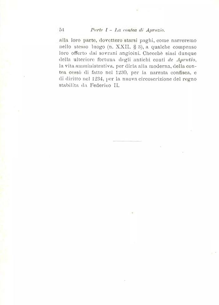 alla loro parte, dovettero starsi paghi, come narreremo nello stesso luogo (n. XXII, § ,3), a qualche compenso loro offerto dai sovrani angioini. Checché siasi dunque della ulteriore fortuna degli antichi conti de Aprutio, la vita amministrativa, per dirla alla moderna, della contea cessò di latto nel 1230. per la narrata confisca, e di diritto ne! 1234, per la nuova circoscrizione del regno stabilita da Federico II.