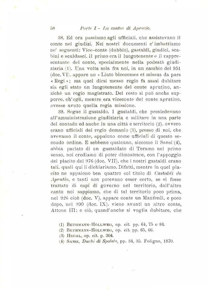 39. Segue il gastaldo. I gastaldi. che presiedevano all'amministrazione giudiziaria e militare in una parte del contado ed anche in una città e territorio (2). ovvero erano ufficiali del regio demanio (3), presso di noi, che avevamo il conte, appaiono come ufficiali di questo secondo ordine. E sebbene qualcuno, siccome il Sansi (4), abbia parlato di un gastaldato di Teramo nel primo senso, noi crediamo di poter dimostrare, con l'appoggio (.lei placito del 976 (doc. VII), che i nostri gastaldi erano tali, quali qui li dichiariamo. Difatti, mentre in quel placito ne appaiono ben quattro col titolo di Castaldi de Aprutio, e tanti non potevano esser certo, se si fosse trattato di capi di governo nel territorio, dall'altro canto noi sappiamo, che di tal territorio poco prima, nel 926 cioè (doc. V), appare conte un Manfredi, e poco dopo, nel 990 (doc. IX), viene avanti un altro conte, Attone III; e ciò, quand'anche si voglia dubitare, che