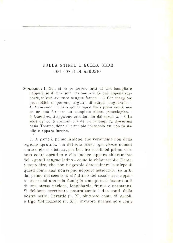 ]. A parto il primo, Anione, che veramente non della regione aprutina, ma del solo rostro apruzģiiisc nomasi conte e che si distacca per ben tre secoli dal primo vero noto conte aprutino e che inoltre appare chiaramente del «gentil sangue latino» come lo chiamerebbe Dante, č uopo diro, che non č agevole determinare la stirpe di questi conti; anzi non si puņ neppure assicurare, se tutti, dal primo del secolo ģx all'ultimo del secolo xiv, appartenessero ad una sola famiglia e neppure so fossero tutti di una stessa nazione, longobarda, franca o normanna. Si debbono eccettuare naturalmente i due conti della nostra serie: Gerardo (n. XI. piuttosto conto di Ascoli, e Ugo Malinozzetto (ri. XI . invasore normanno e. conte