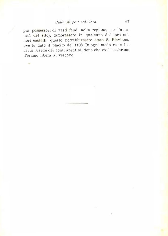 pur possessori di vasti feudi nella regione, per l'amenità del sito), dimorassero in qnalcnno dei loro minori castelli, questo potrebb'essere stato S. Flaviano, ove fu dato il placito del 1108. In ogni modo resta incerta la sede dei conti aprutini, dopo che essi lasciarono Teramo libera al vescovo.