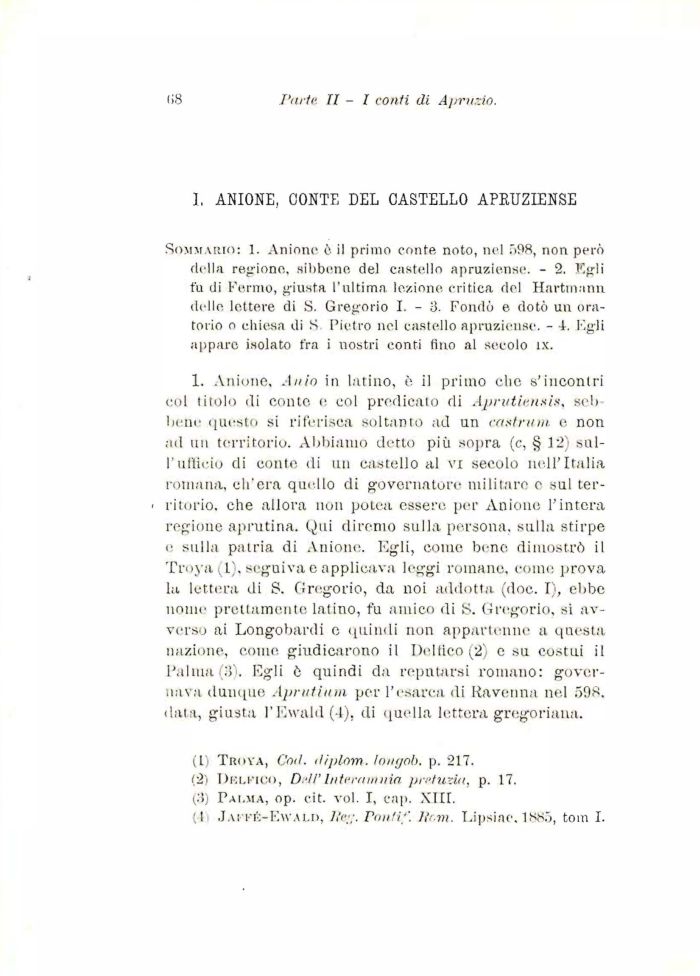 Sommario: 1. Anione ò il primo conte noto, nel 598, non però della regione, sibbene de) castello apruziense. - 2. F,<*li fu di Fermo, giusta l'ultima lezione critica del Hartmann delle lettere di S. Gregorio I. - 3. Fondò e dotò un oratorio o chiesa di S Pietro nel castello apruziense. - Kgli appare isolato fra i nostri conti fino al secolo ix.