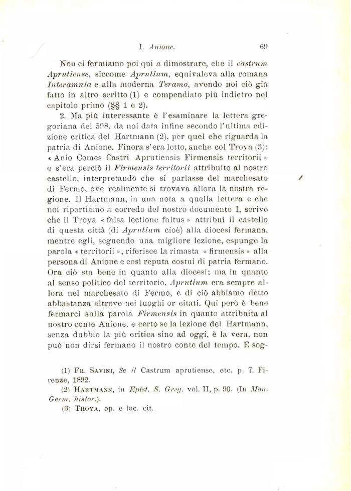 2. Ma più interessante è l'esaminare la lettera gregoriana del SOS. da noi data infine secondo l'ultima edizione critica del Hartmann (2). per quel che riguarda la patria di Anione. Finora s'era letto, anche col Trova (3): « Anio Comes Castri Aprutiensis Firmensis territori! » e s'era perciò il Firmensis territorii attribuito al nostro castello, interpretando che si parlasse del marchesato di Fermo, ove realmente si trovava allora la nostra regione. Il Hartmann, in una nota a quella lettera e che noi riportiamo a corredo del nostro documento I, scrive che il Troya « falsa lectionc faltus » attribuì il castello di questa città (di Aprutium cioè) alla diocesi fermana. mentre egli, seguendo una migliore lezione, espunge la parola « territorii », riferisce la rimasta « firmensis » alla persona di Anione e così reputa costui di patria fermano. Ora ciò sta bene in quanto alla diocesi: ma in quanto al senso politico del territorio, Aprutium era sempre allora nel marchesato di Fermo, e di ciò abbiamo detto abbastanza altrove nei luoghi or citati. Qui però è bene fermarci sulla parola Firmensis in quanto attribuita al nostro conte Anione, e certo se la lezione del Hartmann, senza dubbio la più critica sino ad oggi, è la vera, non può non dirsi fermano il nostro conte del tempo. F. sog-