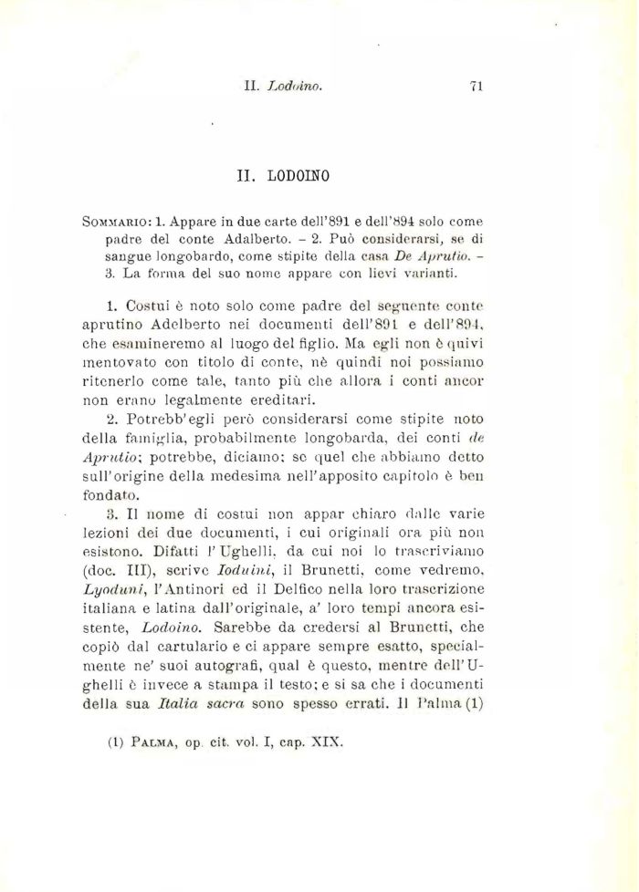 3. Il nome di costui non appar chiaro dalle varie lezioni dei due documenti, i cui originali ora più non esistono. Difatti l'Ughelli, da cui noi lo trascriviamo (doc. Ili), scrive Ioduini, il Brunetti, come vedremo, Lynduni, l'Antinori ed il Delfico nella loro trascrizione italiana e latina dall'originale, a' loro tempi ancora esistente, Lodoino. Sarebbe da credersi al Brunetti, che copiò dal cartulario e ci appare sempre esatto, specialmente ne' suoi autografi, qual è questo, mentre dell'U-ghelli ò invece a stampa il testo; e si sa che i documenti della sua Italia sacra sono spesso errati. 11 l'alma (1)