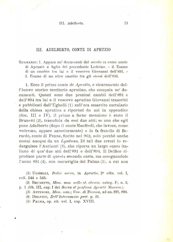 1. Ecco il primo conte de Aprutio, e sicuramente dell'intero storico territorio aprutino, che compaia ne' documenti. Questi sono due preziosi cambii dell'891 o dell'894 tra lui e il vescovo aprutino Giovanni trascritti e pubblicati dall'Ughelli (1) sull'ora smarrito cartulario della chiesa aprutina e riportati da noi in appendice (doc. Ili e IV). Il primo a farne menzione č stato il Brunetti (2), traendola da essi due atri; se non che egli pone Adelberto (dopo il conte Manfredi, che invece, come vedremo, appare anteriormente) e lo fa fratello di Berardo, conte di Penne, fiorito nel 9(i2, solo perchč anche costui nacque da un Lyoduno. Di tali due errori lo redarguisce l'Antėnori (3), che riporta un largo sunto italiano di que'due atti dell'891 e dell'894-. Il Delfico riproduce parte di questa seconda carta, ma assegnandole l'anno 891 (4), con meraviglia del Palma (>;, a cui non