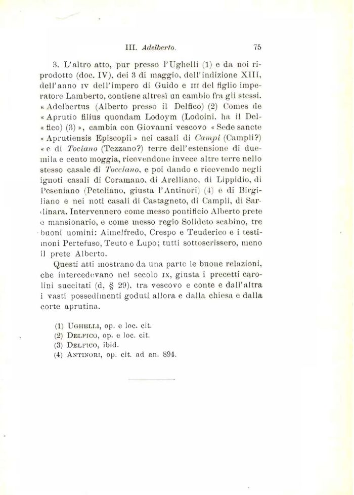 3. L'altro atto, pur presso l'Ughelli (1) e da noi riprodotto (doc. IV), dei 3 di maggio, dell'indizione XIII, dell'anno tv dell'impero di Guido e iri del figlio imperatore Lamberto, contiene altresì un cambio fra gli stessi, n Adelbertus (Alberto presso il Dclflco) (2) Comes de « Aprutio filius quondam Lodoym (Lodoini. ha il Del-« fico) (3) », cambia con Giovanni vescovo « Sede sancte « Aprutieusis Episeopii» nei casali di ('ampi (Campii?) «e di Tociaito (Tezzano?) terre dell'estensione di duemila e ceuto moggia, ricevendone, invece altre terre nello stesso casale di Tacciano, e poi dando e ricevendo negli ignoti casali di Coramano, di Arelliano. di Lippidio, di Pcseniano (Peteliano, giusta l'Antinori (4) e di Birgi-liano e nei noti casali di Castagneto, di Campii, di Sar-dinara. Intervennero come messo pontificio Alberto prete e mansionario, e come messo regio Solideto scabino, tre buoni uomini: Aimelfredo, Crespo e Teuderico e i testimoni Pertefuso, Teuto e Lupo; tutti sottoscrissero, meno il prete Alberto.