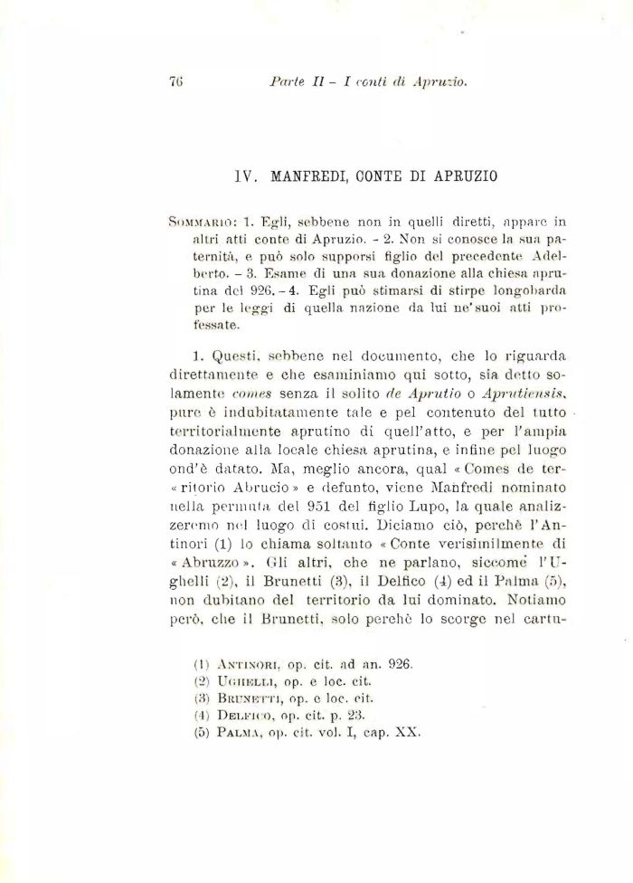1. Questi, sebbene nel documento, che lo riguarda direttamente e che esaminiamo qui sotto, sia detto solamente, comes senza il solito de Aprutio o Apruticnsis. pure è indubitatamente tale e pel contenuto del lutto territorialmente aprutino di quell'atto, e per l'ampia donazione alla locale chiesa aprutina, e infine pel luogo ond'è datato. Ma, meglio ancora, qual « Comes de territorio Abrucio» e defunto, viene Manfredi nominato nella pennuta elei 951 del figlio Lupo, la quale analizzeremo nel luogo di costui. Diciamo ciò, perchè l'Antinori (1) lo chiama soltanto «Conte verisiinilmente di «Abruzzo», (ili altri, che ne parlano, siccome' l'U-ghclli (2), il Brunetti (3), il Delfico (4) ed il Palma (ó), non dubitano del territorio da lui dominato. Notiamo però, che il Brunetti, solo perchè lo scorge nel cartn-