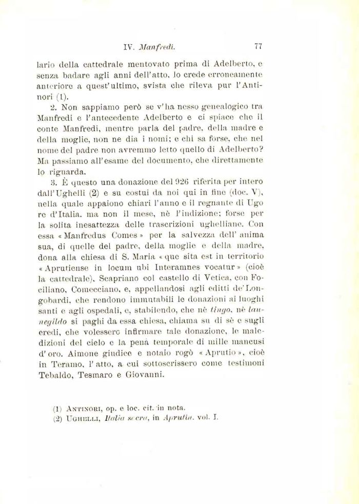 3, E questo una donazione del 026 riferita per intero dall'Ugholli (2) e su costui da noi qui in line (doc. V , nella quale appaiono chiari l'anno c il regnante di l'go re d'Italia, ma non il mese, nň l'indizione: forse polla solita inesattezza delle trascrizioni ughelliane. Con essa « Manfredus Comes» per la salvezza dell'anima sua, di quelle del padre, della moglie e della madre, dona alla chiesa di S. Maria « quo sita est in territorio « Aprutiense in locum ubi Interamnes vocatur » (cioč la cattedrale). Scapriano col castello di Vetiea. con Fo-ciliano, Comeociano, e. appellandosi agli editti de'Longobardi, che rendono immutabili le donazioni ai luoghi santi e agli ospedali, e, stabilendo, che uč tingo, uč tan-negildo si paghi da essa chiesa, chiama su di sč e sugli eredi, che volessero infirmare tale donazione, le maledizioni del cielo e la pena temporale di mille mancusi d'oro. Aimone giudice e notaio rogň «Aprutio», cioč in Teramo, 1' atto, a cui sottoscrissero come testimoni Tebaldo, Tesmaro e Giovanni.