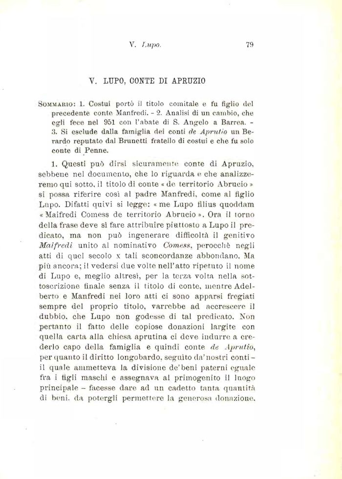 1. Questi può dirsi sicuramente, conte di Apruzio, sebbene nel documento, che lo riguarda e che analizzeremo qui sotto.il titolo di conte « de territorio Abrucio » si possa riferire così al padre Manfredi, come al tiglio Lupo. Difatti quivi si legge.: « me Lupo lìlius quoddam « Maifredi Comess de territorio Abrucio». Ora il torno della frase deve sì fare attribuire piuttosto a Lupo il predicato, ma non può ingenerare difficoltà il genitivo Maifredi unito al nominativo Comes*. perocché negli atti di quel secolo x tali sconcordanze abbondano. Ma più ancora; il vedersi due volte nell'atto ripetuto il nome di Lupo e, meglio altresì, per la terza volta nella sottoscrizione finale senza il titolo di conte, mentre Adel-berto e Manfredi nei loro atti ci sono apparsi fregiati sempre del proprio titolo, varrebbe ad accrescere il dubbio, che Lupo non godesse di tal predicato. Non pertanto il fatto delle copiose donazioni largite con quella carta alla chiesa aprutina ci deve indurre a crederlo capo de,Ila famiglia e quindi conte de Aprutio, per quanto il diritto longobardo, seguito da'nostri condii quale ammetteva la divisione de'beni paterni eguale fra i tigli maschi e assegnava al primogenito il luogo principale - facesse dare ad un cadetto tanta quantità di beni, da potergli permettere la generosa donazione.