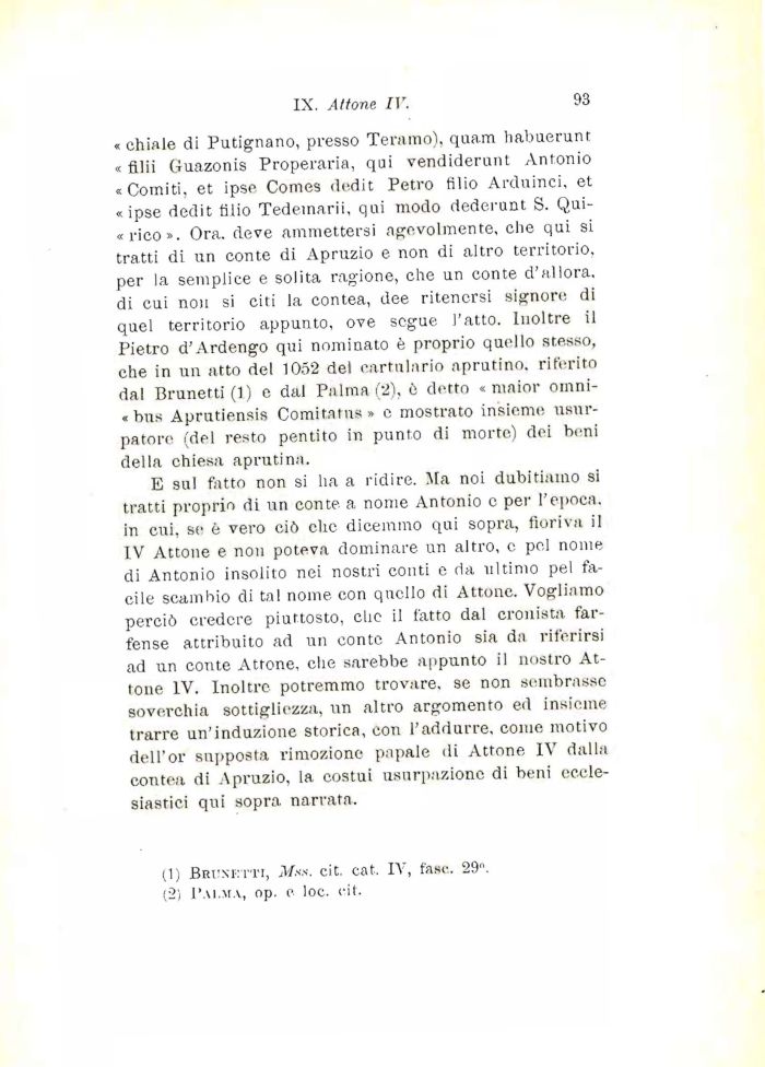 E sul fatto non si ha a ridire. Ma noi dubitiamo si tratti proprio di un conte a nome Antonio e per l'epoca, in cui, se è vero ciò che dicemmo qui sopra, fioriva il IV Attone e non poteva dominare un altro, e pel nome di Antonio insolito nei nostri conti e da ultimo pel facile scambio di tal nome con quello di Attone. Vogliamo perciò credere piuttosto, che il fatto dal cronista far-fense attribuito ad un conte Antonio sia da riferirsi ad un conte Attone, che sarebbe appunto il nostro Attone IV. Inoltre potremmo trovare, se non sembrasse soverchia sottigliezza, un altro argomento ed insieme trarre un'induzione storica, con l'addurre, come motivo dell'or supposta rimozione papale di Attone IV dalla contea di Apruzio, la costui usurpazione di beni ecclesiastici qui sopra narrata.