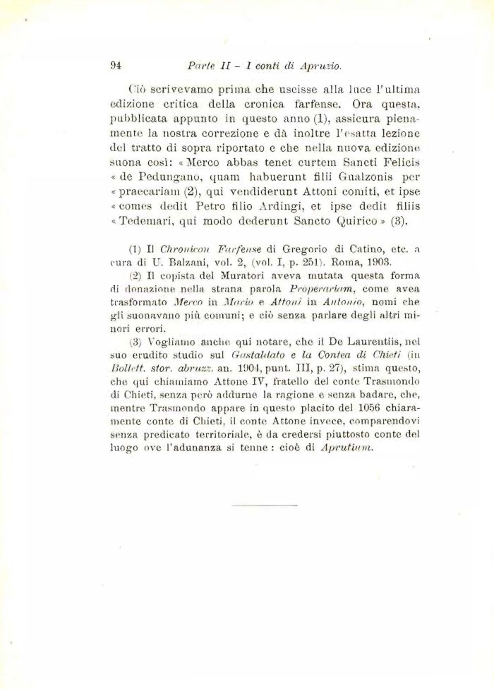 Ciò scrivevamo prima che uscisse alla luce l'ultima edizione critica della cronica farfense. Ora questa, pubblicata appunto in questo anno (1), assicura piena mente la nostra correzione e da inoltre l'esatta lezione del tratto di sopra riportato e che nella nuova edizione, suona cosi: «Merco abbas tenet curtein Sancti Felicis « de Pedungano, quam habuerunt filii fiualzonis per « praecariam (2), qui vendiderunt Attoni corniti, et ipse «comes dedit Pet.ro tilio Ardingi, et ipse dedit ti li i s «Tedeniari, qui modo dederunt Sancto Quirico » (3).