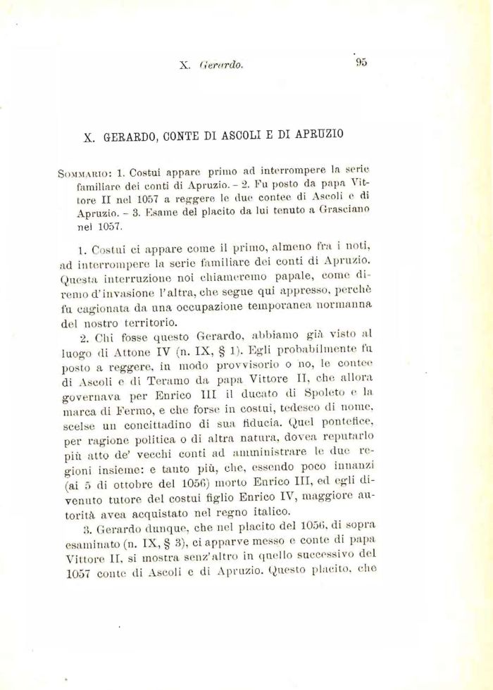 :>. Gerardo dunque, che nel placito del 1050. di sopra esaminato (ri. IX, § 3), ci apparve messo e conte di papa Vittore II, si mostra senz'altro in quello successivo del 1057 conte di Ascoli c di Apruzio. Questo placito, elio
