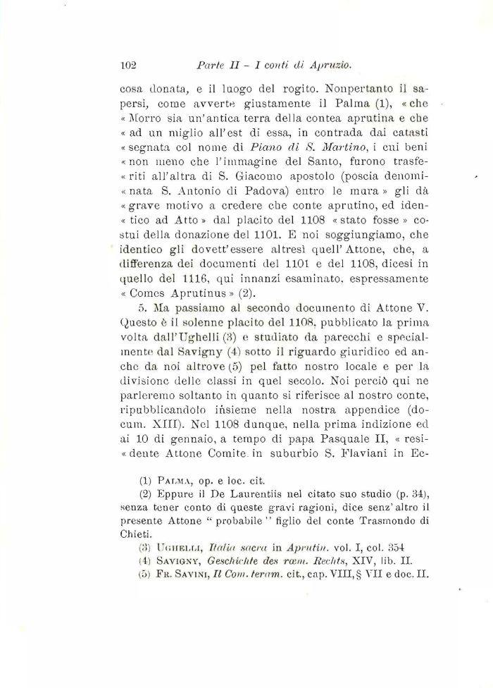 cosa donata, e il luogo del rogito. Nonpertanto il sapersi, come avverte giustamente il Palma (1), «che « Morro sia un'antica terra della contea aprutina e che « ad un miglio all'est di essa, in contrada dai catasti « segnata col nome di Piano di S. Martino, i cui beni «non meno che l'immagine del Santo, furono trasfe-« riti all'altra di S. Giacomo apostolo (poscia denomi-« nata S. Antonio di Padova) entro le mura» gli dà «grave motivo a credere che conte aprutino, ed iden-« tico ad Atto» dal placito del 1108 «stato fosse» costui della donazione del 1101. E noi soggiungiamo, che identico gli dovett'essere altresì queir Attone, che, a differenza dei documenti del 1101 e del 1108, dicesi in quello del 1116, qui innanzi esaminato, espressamente « Comes Aprutinus » (2).