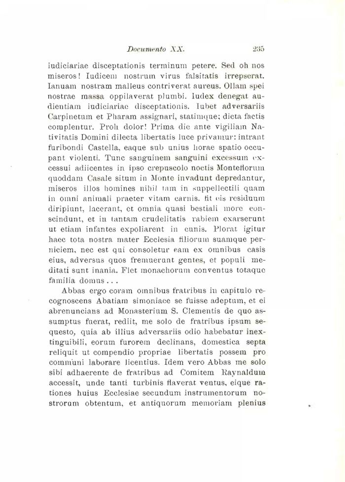 iudiciariae disceptationis terminum petere. Sed oh nos miseros! Iudicem nostrum virus falsitatis irrepserat. Ianuam nostram malleus contriverat aureus. Ollain spei nostrae massa oppilaverat plumbi. ludex denegai au-dientiam iudiciariae disceptationis. Iubet adversariis Carpi netum et Pharam assignari, statimene; dieta factis coiuplentur. Proli dolor! Prima die ante vigiliain Na-tivitatis Domini dilecta libertatis luce privamur: intrant furibondi Castella, eaque sub unius liorae spatio occu-pant violenti. Tunc sanguinem sanguini exeessuin ex-eessui adiicentes in ipso crepuscolo noetis Montelioriun quoddam Casale situili in Monte invadunt depredantur, miseros illos liomines nihil lam in suppellectili quam in omni animali praeter vitam carnis. tit eis rcsiduum diripiunt, lacerant, et omnia quasi bestiali more con-scindunt, et in tantam crudelitatis vabiem exarserunt ut etiam infantes expoliarent in cunis. Plorat igitur haec tota nostra mater Ecclesia filioruin suamque per-niciem, nec est qui consoletur eam ex omnibus casis eius, adversus quos freniuerunt genies, et populi meditati sunt inania. Flet monachorum conventus totaque familia doiiius .. .