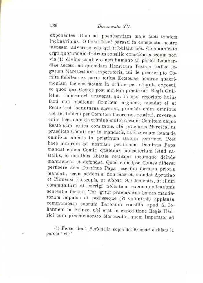 exponentes illuni ad poenitentiam male facti tandem inclinavirnus. 0 bone Iesu! parasti in eonspeetu nostro mensam adversus eos qui tribulant nos. Communieato ergo quorundam fratrum Consilio conscientia sccum non via (1), divino conducto non humano ad partes Loinbar-diae accessi ad quemdam Henricum Testam Italiae le-gatum Marescallum Imperatoris, cui de praescripto Co-mite flebilem ex parte totius Ecclesiae nostrae quaeri-moniam faciens factum in ordine per singula exposui, eo quod ipse Comes post mortem praetaxati Regis Guil-lelmi Imperatori iuraverat, qui in suo rescripto huius facti non modicutn Comitem arguens, mandat ei ut Reate ipsi loquuturus accedat, promisit enim omnibus ablatis ibidem per Comitem facere nos restitú, reversus enim licet cum discrimine multo dictum Comitem usque Reate sum postea comitatus, ubi praefatus Marescallus pracdicto Corniti dat in mandatis, utEcclesiam istam de omnibus ablatis in pristinum statum reformet. Post haec nimirum ad nostrani petitionem Dominus Papa mandat eidem Corniti quatenus monasterium istud ca-stellis, et omnibus ablatis restituat ipsumque deinde manuteneat et defendat. Quod cum ipse Comes differet perf́cere item Dominus Papa rescribit formam prioris mandati, secus addens si non faceret, mandat Aprutino et Pinnensi Episcopis, et Abbati S. Clementis, ut illum communitum et corrigi nolentem excommunicationis sententia feriant. Tot igitur praetaxatus Comes manda-torum impulsu et pedisseque (?) voluntatis applausu communieato suorum Baronum Consilio apnd S. Io-hannem in Balneo. ubi erat in expeditione Regis Hen-rici cum praememorato Marescallo, quem Imperator ad