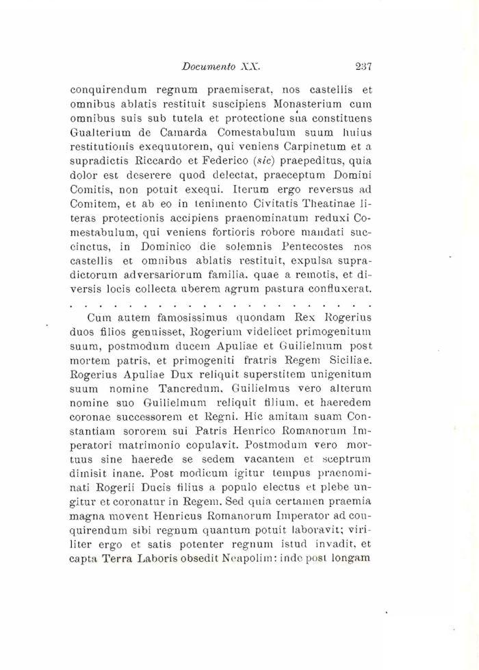 Cum autem famosissimus quondam Rex Rogerius duos filios genuisset, Rogerium videlicet primogenitum suum, postmodum ducein Apuliae et Guilielnium post mortem patris, et primogeniti fratris Regem Siciliae. Rogerius Apuliae Dux reliquit superstitem unigenitum suum nomine Tancredum, Guilielmus vero alterum nomine suo Guilielnium reliquit tiJium. et haeredem coronae successorem et Regni. Hic amitam suam Con-stantiam sororem sui Patris Henrico Romanorum Imperatori matrimonio copulavit. Postmodum vero mov-tuus si ne haerede se sedem vacantem et sceptrum dimisit inane. Post modicum igitur tempus pracnomi-nati Rogerii Ducis tilius a populo electus et plebe un-gitur et coronatur in Regem. Sed quia certainen praemia magna movent Henricus Romanorum Imperator ad conquirendum sibi regnum quantum potuit laboravit; viri-liter ergo et satis potenter regnum istud invadit. et capta Terra Laboris obsedit Neapolim: indo post longam