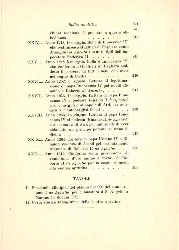 'XXIV.... Anno 1248, 1° maggio. Bolla di Innocenzo IV, che restituisce a Gualtieri di Pagliara conte Manopelli ci Aprutii i beni toltigli dall'imperatore Federico II........245