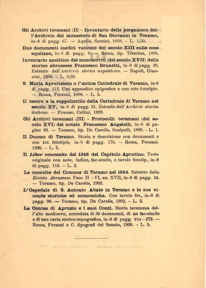 Il Liber censualis del 1348 del Capitolo Aprutino. Testo originale con note, indice, fac-simile, e tavole fototip., in-8 di pagg. 116. - L. 2. Le consulte del Comune di Teramo nel 1554. Estratto dalla Rivista Abruzzese. Fase. II - VI, an. XVII, in-8 di pagg. 34.
