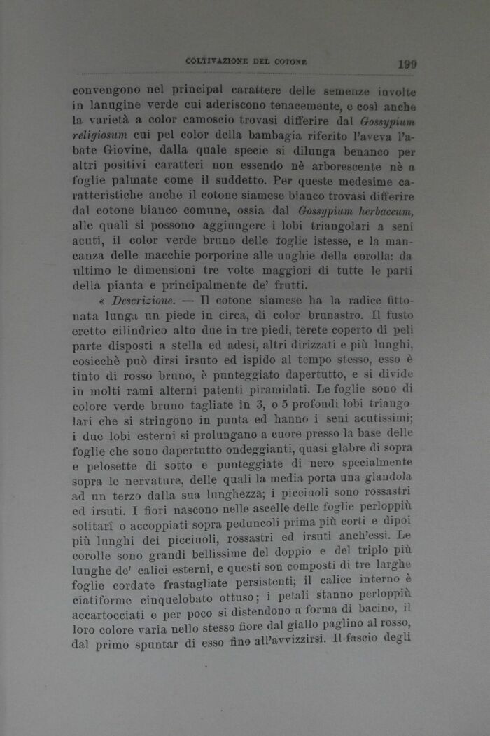 convengono nel principal carattere delle semenze involte in lanugine verde cui aderiscono tenacemente, e così anche la varietà a color camoscio trovasi differire dal Gossypium religiosum cui pel color della bambagia riferito l'aveva l'abate Giovine, dalla quale specie si dilunga benanco per altri positivi caratteri non essendo nè arborescente nè a foglie palmate come il suddetto. Per queste medesime caratteristiche anche il cotone siamese bianco trovasi differire dal cotone bianco comune, ossia dal Gossypium herbaceum, alle quali si possono aggiungere i lobi triangolari a seni acuti, il color verde bruno delie foglie istesse, e la mancanza delle macchie porporine alle unghie della corolla: da ultimo le dimensioni tre volte maggiori di tutte le parti della pianta e principalmente de' frutti.