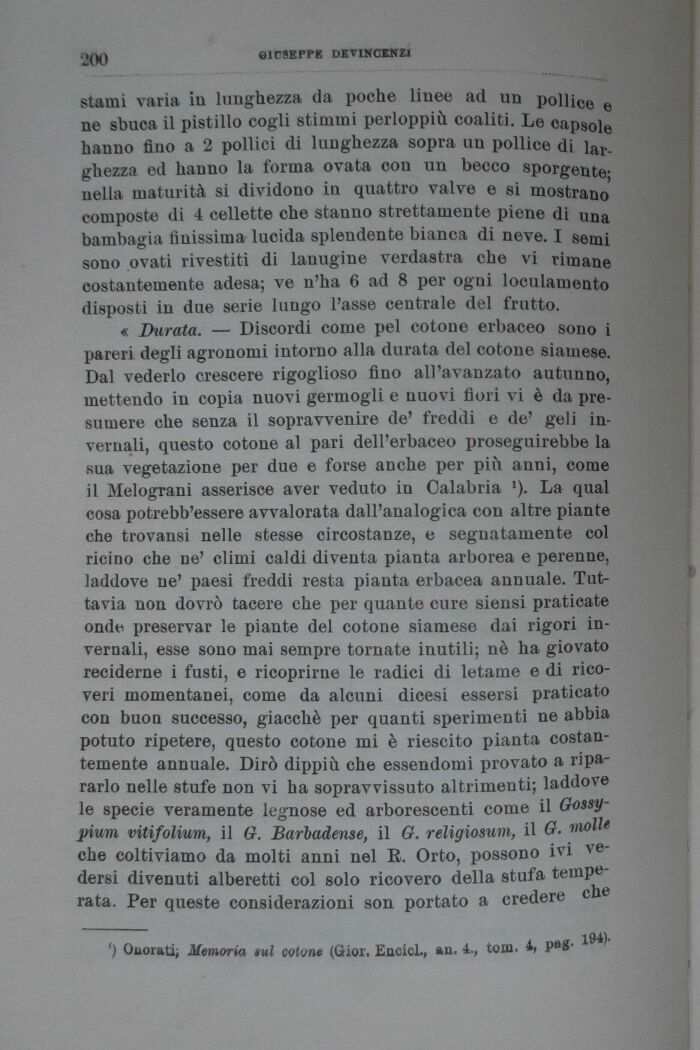 « Durata. Discordi come pel cotone erbaceo sono i pareri degli agronomi intorno alla durata del cotone siamese. Dal vederlo crescere rigoglioso fino all'avanzato autunno, mettendo in copia nuovi germogli e nuovi fiori vi è da presumere che senza il sopravvenire de' freddi e de' geli invernali, questo cotone al pari dell'erbaceo proseguirebbe la sua vegetazione per due e forse anche per più anni, come il Melograni asserisce aver veduto in Calabria *). La qual cosa potrebb'essere avvalorata dall'analogica con altre piante che trovansi nelle stesse circostanze, e segnatamente col ricino che ne' climi caldi diventa pianta arborea e perenne, laddove ne' paesi freddi resta pianta erbacea annuale. Tuttavia non dovrò tacere che per quante cure siensi praticate onde preservar le piante del cotone siamese dai rigori invernali, esse sono mai sempre tornate inutili; nè ha giovato reciderne i fusti, e ricoprirne le radici di letame e di ricoveri momentanei, come da alcuni dicesi essersi praticato con buon successo, giacché per quanti sperimenti ne abbia potuto ripetere, questo cotone mi è riescito pianta costantemente annuale. Dirò dippiù. che essendomi provato a ripararlo nelle stufe non vi ha sopravvissuto altrimenti; laddove le specie veramente legnose ed arborescenti come il Gossy-pium vitifolium, il G. Barladense, il G. religiosum, il G. molle che coltiviamo da molti anni nel E. Orto, possono ivi vedersi divenuti alberetti col solo ricovero della stufa temperata. Per queste considerazioni son portato a credere che
