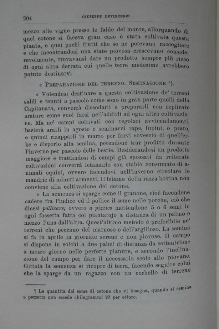 « Volendosi destinare a questa coltivazione de' terreni saldi e tenuti a pascolo come sono in gran parte quelli della Capitanata, converrà dissodarli e prepararli con replicate arature come suol farsi nell'addirli ad ogni altra coltivazione. Ma ne' campi coltivati con regolari avvicendamenti, basterà ararli in agosto e seminarvi rape, lupini, o prato, e quindi rizapparli in marzo per farvi sovescio di quell'erbe e disporlo alla semina, potendone trar profitto durante l'inverno per pascolo delle bestie. Desiderandosi un prodotto maggiore e trattandosi di campi già spossati da reiterate coltivazioni converrà letamarlo con stabio consumato di a-nimali equini, ovvero facendovi nell'inverno circolare le mandrie di minuti armenti. Il letame della razza bovina non conviene alla coltivazione del cotone.