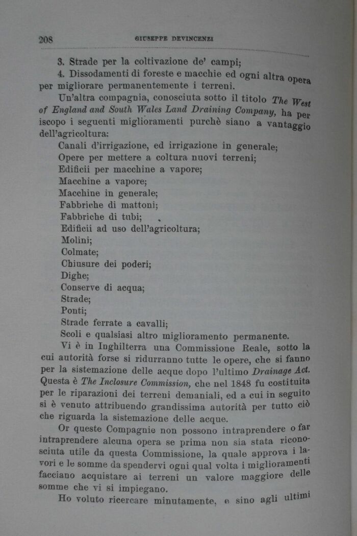 Vi è in Inghilterra una Commissione Reale, sotto la cui autorità forse si ridurranno tutte le opere, che si fanno per la sistemazione delle acque dopo l'ultimo Drainage Act. Questa è The Inclosure Commission, che nel 1848 fu costituita per le riparazioni dei terreni demaniali, ed a cui in seguito si è venuto attribuendo grandissima autorità per tutto ciò che riguarda la sistemazione delle acque.