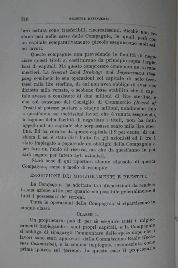 Queste compagnie non prevedendo le facilità di negoziare questi titoli si costituirono da principio sopra larghe basi di capitali. Ma questo compresero come non ne aveano mestieri. La General Land Drainage and Improvement Company cominciò le sue operazioni col capitale di solo trentasei mila lire sterline, di cui non avea obbligo di aver che diciotto mila versate, e sebbene fosse stabilito che il capitale avesse a consistere di due milioni di lire sterline, e che col consenso del Consiglio di Commercio (Board of Trade) si potesse portare a cinque milioni, nondimeno fino a quest'anno coi moltissimi lavori che è venuta eseguendo, a cagione della facilità di negoziare i titoli, non ha fatto appello ad un capitale che sorpassasse cento mila lire sterline. Ed ha ritratto da questo capitale il 9 per cento, di cui sinora il sei è stato distribuito fra gli azionisti ed il tre è stato impiegato a pagare alcuni obblighi della Compagnia e per fare un fondo di riserva, ma che da quest'anno in poi sarà pagato per intero agli azionisti.