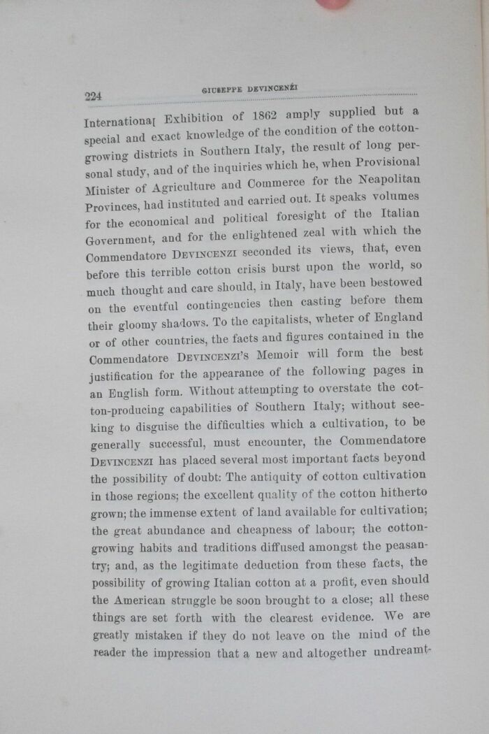 Internationa[ Exhibition of 1862 amply supplied but a special and exact knowledge of the condition of the cotton-growing districts in Southern Italy, the result of long personal study, and of the inquiries which he, when Provisionai Minister of Agriculture and Commerce for the Neapolitan Provinces, had instituted and oarried out. It speaks volumes for the economical and politicai foresight of the Italian Government, and for the enlightened zeal witli which the Commendatoro Devincenzi seconded its views, that, even before this terrible cotton crisis burst upon the world, so much thought and care should, in Italy, liave been bestowed on the eventful contingencies then casting before them their gloomy shadows. To the capitalists, wheter of England or of other countries, the facts and fìgures contained in the Commendatore Devincenzi's Memoir will form the best jastifìcation for the appearance of the following pages in an English form. Without attempting to overstate the cot-ton-producing capabilities of Southern Italy; without see-king to disguise the diffìculties which a cultivation, to be generally successful, must encounter, the Commendatore Devincenzi has placed several most important facts beyond the possibility of doubt: The antiquity of cotton cultivation in those regions; the excellent quality of the cotton hitherto grown; the immense extent of land available for cultivation; the great abundance and cheapness of labour; the cotton-growing habits and traditious diffused amongst the peasan-try; and, as the legitimate deduction from these facts, the possibility of growing Italian cotton at a profìt, even should the American struggi e be soon brought to a dose; ali these things are set forth with the clearest evidence. We are greatly mistaken if they do not leave on the mind of the reader the impression that a new and altogether undreamt-