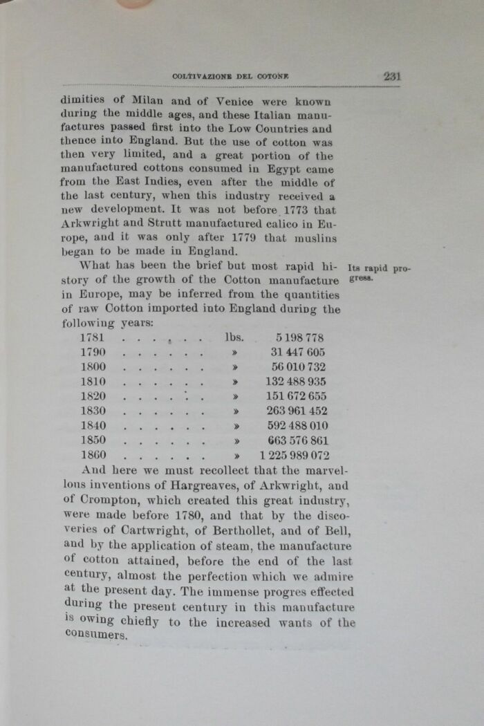 diinities of Milan and of Venie© were known during the middle ages, and these Italian manu-factures passed first into the Low Countries and thence into England. But the use of cotton was then very limited, and a great portion of the manufactured cottons consumed in Egypt carne from the East Indies, even after the middle of the last century, when this industry received a uew development. It was not before 1773 that Arkwright and Strutt manufactured calic̣ in Europe, and it was only after 1779 that muslins began to be made in England.