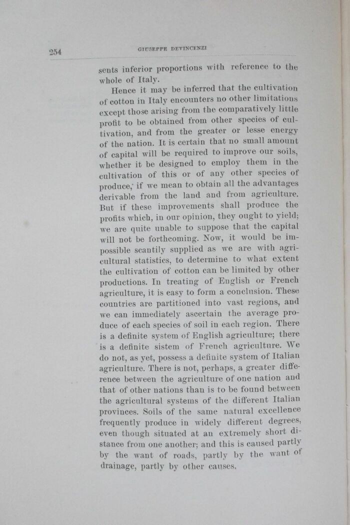 Hence it may be inferred that the cultivation of cotton in Italy encounters no other limi tati ons except those arising from the comparatively little prò lì t to be obtainecl from other species of cultivation, and from the greater or lesse energy of the nation. It is certain that no small amount of capital will be required to improve our soils, whether it be designed to employ them in the cultivation of this or of any other species of produce; if we mean to obtain ali the advantages derivable from the land and from agriculture. But if these improvements shall produce the profits which, in our opinion, they ought to yield; we are quite unable to suppose that the capital will not be forthcoming. Now, it would be im-possible scantily supplied as we are with agri-cultural statistics, to determine to what extent the cultivation of cotton can be limited by other productions. In treating of English or French agriculture, it is easy to form a conclusion. These countries are partitioned into vast regions, and we can immediately ascertain the average produce of each species of soil in eacli region. There is a definite system of English agriculture; there is a definite sistern of French agriculture. We do not, as yet, possess a definite system of Italian agriculture. There is not, perhaps, a greater diffe-rence between the agriculture of one nation and that of other nations than is to be found between the agricultural systems of the different Italian provinces. Soils of the same naturai excellence frequently produce in widely different degrees, even though situated at an extremely short di-stance from one another; and this is caused partly by the want of roads, partly by the want of drainage, partly by other causes.