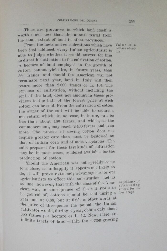 From the facts and considerations which have Value of a been just adduced, every Italian agriculturist is [,*tareo{(Mt able to judge whether it would answer for bim to direct bis attention to the cultivation of cotton. A hectare of land employed in the growth of cottoli cannot yield les, in future years, than 366 francs, and should the American war not terminate next year, land in Italy will tlien return more than 2 600 francs or L. 104. The expense of cultivation, without including the rent of the land, does not amount in those provinces to the half of the lowest price at wich cotton can be sold. From the cultivation of cottoli the owner of the soil will be able to secure a net return which, in no case, in future, can be less than about 180 francs, and which, at the commencement, inay reach 2 400 francs, and even more. The process of sowing cotton does not require greater care than must be bestowed on that of Indian corn and of most vegetables. The soils prepared for these last kinds of cultivation may be, in most cases, rendered available for the production of cotton.