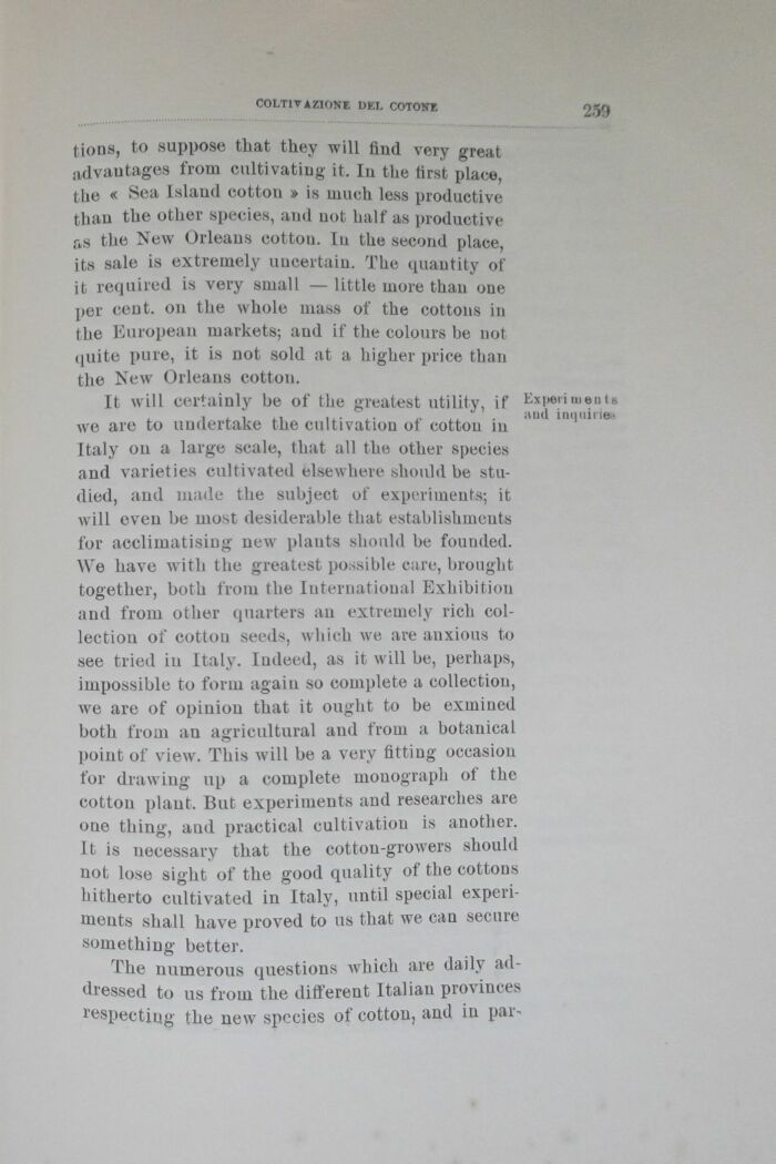 It will certainly be of the greatest utility, if ExpenujentB we are to uudertake the cultivation of cotton in and Inqulrla* Italy 011 a large scale, that ali tbe other species and varieties cultivated elsewhere should be stu-died, and made the subject of experiinents; it will even be most desiderable that establishmcnts for acclimatising new plants should be founded. We have with the greatest possible care, brought together, both from tbe International Exhibition and from other quarters an extremely rich col-lection of cotton seeds, which we are anxious to see tried in Italy. Indeed, as it will be, perhaps, impossible to form again so complete a collection, we are of opinion that it ought to be exmined both from an agricultural and from a botanical point of view. This will be a very fitting occasion for drawing up a complete monograpli of the cotton plant. But experiments and researches are one tbing, and practicai cultivation is anotlier. It is necessary that the cotton-growers should not lose sight of the good quality of the cottons hitherto cultivated in Italy, until special experiments shall have proved to us that we can secure something better.