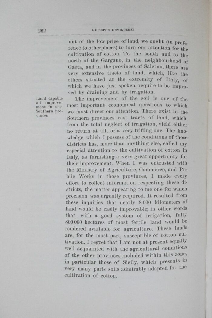 unt of the low price of land, we ought (in prefe-rence to otherplaces) to turn our attention for the cultivation of cotton. To the south and to the north of the Gargano, in the neighbourhood of Gaeta, and in the provinces of Salerno, there are very extensive tracts of land, which, like the others situated at the extremity of Italy, 0f which we have just spoken, require to be impro-ved by drainiug and by irrigation. Land capable The improvemeut of the soil is one of the ment^n"!!^ most importante ecouomical questions to which Southern prņ- we must direct our attention. There exist in the Southern provinces vast tracts of land, which, from the total neglect of irrigation, vield either no return at ali, ora very trifliug one. The kno-wledge which I possess of the conditions of those districts has, more than anything else, called my especial attention to the cultivation of cotton in Italy, as furnishing a very great opportunity for their improvement. When I was entrusted with the Ministry of Agriculture, Commerce, and Public Works in those provinces, I made every effort to collect inforniation respecting these districts, the matter appearing to me one for which precision was urgently required. It resulted from these inquiries that nearly 8 000 kilometers of land would be easily improvable; in other words that, with a good system of irrigation, fully 800000 hectares of most fertile land would be rendered available for agriculture. These lands are, for the most part, susceptible of cotton cultivation. I regret that I am not at present equally well acquainted with the agricultural conditions of the other provinces included within this zone, in particular those of Sicily, which preselits in very many parts soils admirably adapted for the cultivation of cotton.