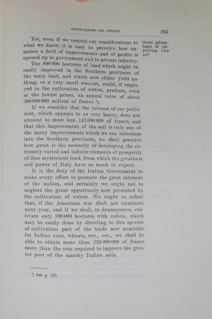 It is the duty of the Italian Government to make every effort to promote the great interests of the nation, and certainly we ought not to neglect the great opportunity now presented by the cultivation of cotton. We ought to reflect that, if the American war shall not terminate next year, and if we shall, in donsequence, cul-tivate only 100 000 hectares with cotton, which may be easily doue by directing to this species of cultivation part of the lands now available for Indian corn, wheats, ecc., ecc., we shall be able to obtain more than 250 000000 of francs more than the sum required to improve the greater part of the marsby Italian soils.
