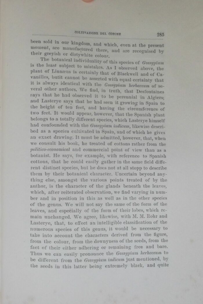The bota ni cai individuality of this species of Gossypium is the least subject to inistakcs. As I observed above, the plant of Linnceus is certainly that of Blackwell and of Ca-vanilles, butit cannot be asserted with equal certainty that it is always identical with the Gossyvium herbaceum of se-veral other authors. \Ye find, in truth, that Desfontaines eays that he had observed it to be perennial in Algiers; and Lasterye says that he had seen it growing in Spain to the height of ten feet, and having the circumference of tw o feet. It would appear, however, that the Spanish plant belongs to a totally different species, which Lasterye biniseli' had confounded with the Gossyinum indicum, likewise descri-bed as a species cultivated in Spain, and of which he gives an exact drawing. It Tiìust be admitted, however, that, when we consult his book, he treated of cottons rather from the politico-economical and commercial point of view than as a botanist. He says, for example, with reference to Spanish cottons, that he coubl easily gather in the same field different disti net species, but he does not at ali stopp to describe them by their botanical character. Uncertain beyond auy-thing else, amongst the various points treated of by the author, is the character of the glantls beneath the leaves, which, after reiterateti observation, we find varying in uuui-ber and in position in this as well as in the other species of the genus. We will not say the same of the forni of the leaves, and espeeially of the forni of their lobes, which remai n unchanged. We agree, likewise, with M. M. E olir and Lasterye, that, to effect an intelligible classifìcation of the numerous species of this geuus, it would be necessary to take into account the characters derived from the figure, from the colour, from the downyness of the seeds, from the fact of their either adhering or remaiuing free and bare. Thus we can easily prononnee the Gossypium herbaceum to be different from the Gossypium indicum just mentioned, by the seeds in this latter being extremely black, and quite