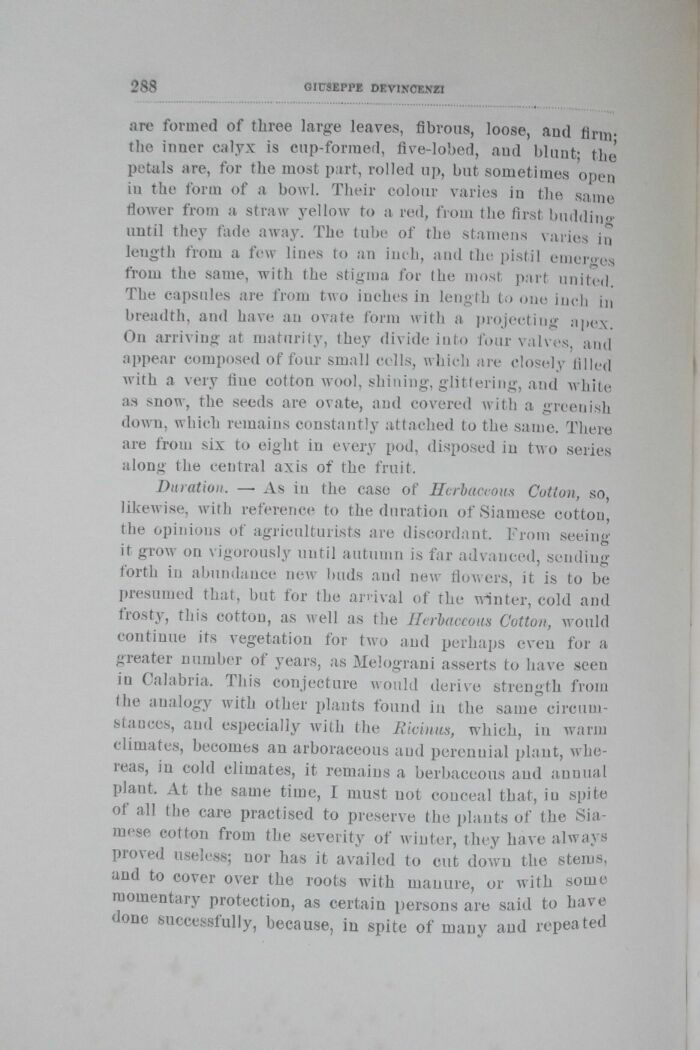 Duration. " As in the case of Herbaceous Cotton, so, likewise, with reference to the duration of Siamese cottou, the opinious of agriculturists are discordant. From seeing it grow on vigorously uutil autumn is far advauced, sendiug forth in abundance new buds and new flowers, it is to be presumed that, but for the arrivai of the winter, cold and frosty, this cotton, as well as the Herbaceous Cotton, would continue its vegetatiou for two and perhaps even for a greater number of years, as Melograni asserts to have seen iu Calabria. This conjecture would derive strength from the analogy with other plants found in tlie sanie circum-stances, and especially Avitli the Ricinns, which, in warin climates, becomes an arboraceous aud perenuial plant, Avlie-reas, in cold climates, it remains a berbaceous aud annual plant. At the sanie time, I must uot couceal that, iu spi te of ali the care practised to preserve the plants of the Siamese cotton from the severity of winter, they ha\e always proved useless; uor has it availed to cut cIoavu the steius, and to cover over the roots with mauure, or Avith some momentary protection, as certaiu persons are said to have done successfully, because, in spite of many aud repeated