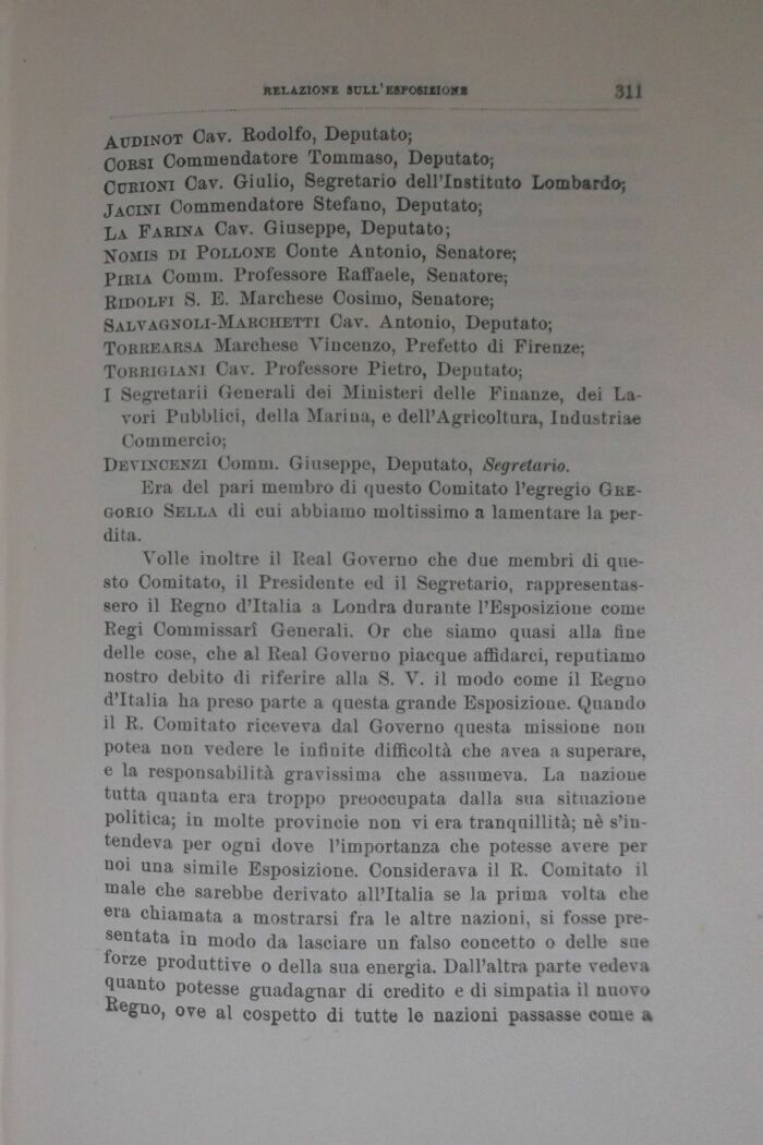 Volle inoltre il Real Governo che due membri di questo Comitato, il Presidente ed il Segretario, rappresentassero il Regno d'Italia a Londra durante l'Esposizione come Regi Commissari Generali. Or che siamo quasi alla fine delle cose, che al Real Governo piacque affidarci, reputiamo nostro debito di riferire alla S. V. il modo come il Regno d'Italia ha preso parte a questa grande Esposizione. Quando il R. Comitato riceveva dal Governo questa missione non potea non vedere le infinite difficoltà che avea a superare, e la responsabilità gravissima che assumeva. La nazione tutta quanta era troppo preoccupata dalla sua situazione politica; in molte provincie non vi era tranquillità; nè s'intendeva per ogni dove l'importanza che potesse avere per uoi una simile Esposizione. Considerava il R. Comitato il male che sarebbe derivato all'Italia se la prima volta che era chiamata a mostrarsi fra le altre nazioni, si fosse presentata in modo da lasciare un falso concetto o delte sue forze produttive o della sua energia. Dall'altra parte vedeva quanto potesse guadagnar di credito e di simpatia il nuovo Regno, ove al cospetto di tutte le nazioni passasse come a