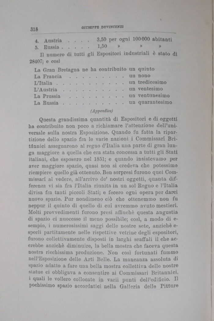 Questa grandissima quantità di Espositori e di oggetti ha contribuito non poco a richiamare l'attenzione dell'universale sulla nostra Esposizione. Quaudo fu fatta la ripartizione dello spazio fra le varie nazioni i Commissari Britannici assegnarono al regno d'Italia una parte di gran lunga maggiore a quella che era stata concessa a tutti gli Stati italiani, che esposero nel 1851; e quando insistevamo per aver maggiore spazio, quasi non si credeva che potessimo riempiere quello già ottenuto. Ben sorpresi furono quei Commissari al vedere, all'arrivo de' nostri oggetti, quanta differenza vi sia fra l'Italia riunita in un sol Regno e l'Italia divisa fra tanti piccoli Stati; e fecero ogni opera per darci nuovo spazio. Pur nondimeno ciò che ottenemmo nou fu neppur il quinto di quello di cui avremmo avuto mestieri. Molti provvedimenti furono presi afliuchè questa angustia di spazio ci nuocesse il meno possibile; così, a modo di e-sempio, i numerosissimi saggi delle nostre sete, anziché e-sporli patitamente nelle rispettive vetrine degli espositori, furono collettivamente disposti in larghi scaffali il che accrebbe anziché diminuire, la bella mostra che faceva questa nostra ricchissima produzione. Non così fortunati fummo nell'Esposizione delle Arti Belle. La mancanza assoluta di spazio adatto a fare una bella mostra collettiva delle nostre slatue ci obbligava a consentire ai Commissari Britannici, i quali le vollero collocate in varii punti dell'edificio. Il pochissimo spazio accordatici nella Galleria delle Pitture