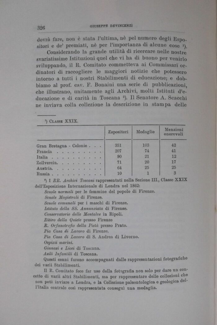 Considerando la grande utilità di ricercare nelle nostre svariatissime Istituzioni quel che vi ha di buono per venirlo sviluppando, il R. Comitato commetteva ai Commissari ordinatori di raccogliere le maggiori notizie che potessero intorno a tutti i nostri Stabilimenti di educazione; e dobbiamo al prof. cav. F. Bonaini una serie di pubblicazioni, che illustrano, unitamente agli Archivi, molti Istituti d'educazione e di carità in Toscana 2). Il Senatore A. Scacchi ne inviava colla collezione la descrizione iu stampa delie