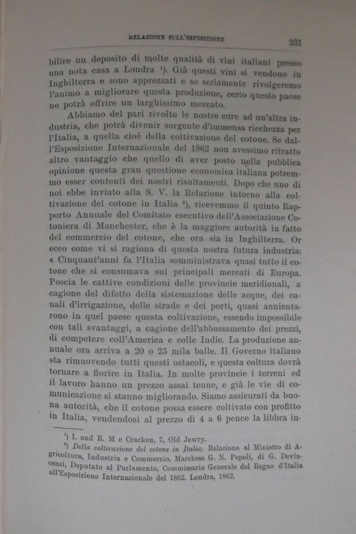 Abbiamo del pari rivolto le nostre cure ad un'altra industria, che potrà divenir sorgente d'immensa ricchezza per l'Italia, a quella cioè della coltivazione del cotone. Se dall'Esposizione Internazionale del 18G2 non avessimo ritratto altro vantaggio che quello di aver posto nella pubblica opinione questa gran questione economica italiana potremmo esser contenti dei nostri risnltamenti. Dopo che uno di noi ebbe inviato alla S. V. la Relazione intorno alla coltivazione del cotone in Italia 2), ricevemmo il quinto Rapporto Annuale del Comitato esecutivo dell'Associazione Cotoniera di Manchester, che è la maggiore autorità in fatto del commercio del cotone, che ora sia in Inghilterra. Or ecco come vi si ragiona di questa nostra futura industria: « Cinquant'anni fa l'Italia somministrava quasi tutto il cotone che si consumava sui principali mercati di Europa. Poscia le cattive condizioni delle provincie meridionali, a cagione del difetto della sistemazione delle acque, dei canali d'irrigazione, delle strade e dei porti, quasi annientarono in quel paese questa coltivazione, essendo impossibile con tali svantaggi, a cagione dell'abbassamento dei prezzi, di competere coll'America e colle Indie. La produzione annuale ora arriva a 20 o 25 mila balle. Il Governo italiano sta rimuovendo tutti questi ostacoli, e questa coltura dovrà tornare a fiorire in Italia. In molte provincie i terreni ed il lavoro hanno un prezzo assai tenue, e già le vie di comunicazione si stanno migliorando. Siamo assicurati da buona autorità, che il cotone possa essere coltivato con profitto in Italia, vendendosi al prezzo di 4 a 6 pence la libbra in-