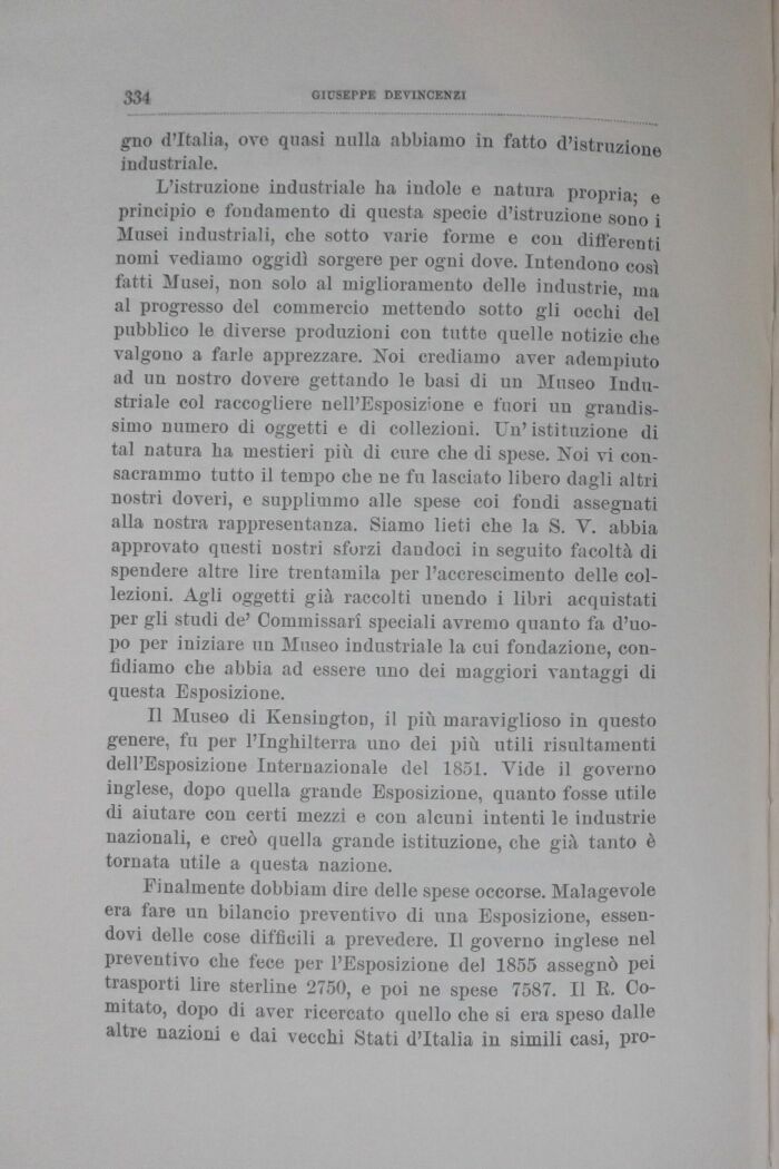 L'istruzione industriale ha indole e natura propria; e principio e fondamento di questa specie d'istruzione sono i Musei industriali, che sotto varie forme e con differenti nomi vediamo oggidì sorgere per ogni dove. Intendono così fatti Musei, non solo al miglioramento delle industrie, ma al progresso del commercio mettendo sotto gli occhi del pubblico le diverse produzioni con tutte quelle notizie che valgono a farle apprezzare. Noi crediamo aver adempiuto ad un nostro dovere gettando le basi di un Museo Industriale col raccogliere nell'Esposizione e fuori un grandissimo numero di oggetti e di collezioni. Un' istituzione di tal natura ha mestieri più di cure che di spese. Noi vi consacrammo tutto il tempo che ne fu lasciato libero dagli altri nostri doveri, e supplimmo alle spese coi fondi assegnati alla nostra rappresentanza. Siamo lieti che la S. V. abbia approvato questi nostri sforzi dandoci in seguito facoltà di spendere altre lire trentamila per l'accrescimento delle collezioni. Agli oggetti già raccolti unendo i libri acquistati per gli studi de' Commissari speciali avremo quanto fa d'uopo per iniziare un Museo industriale la cui fondazione, confidiamo che abbia ad essere uno dei maggiori vantaggi di questa Esposizione.