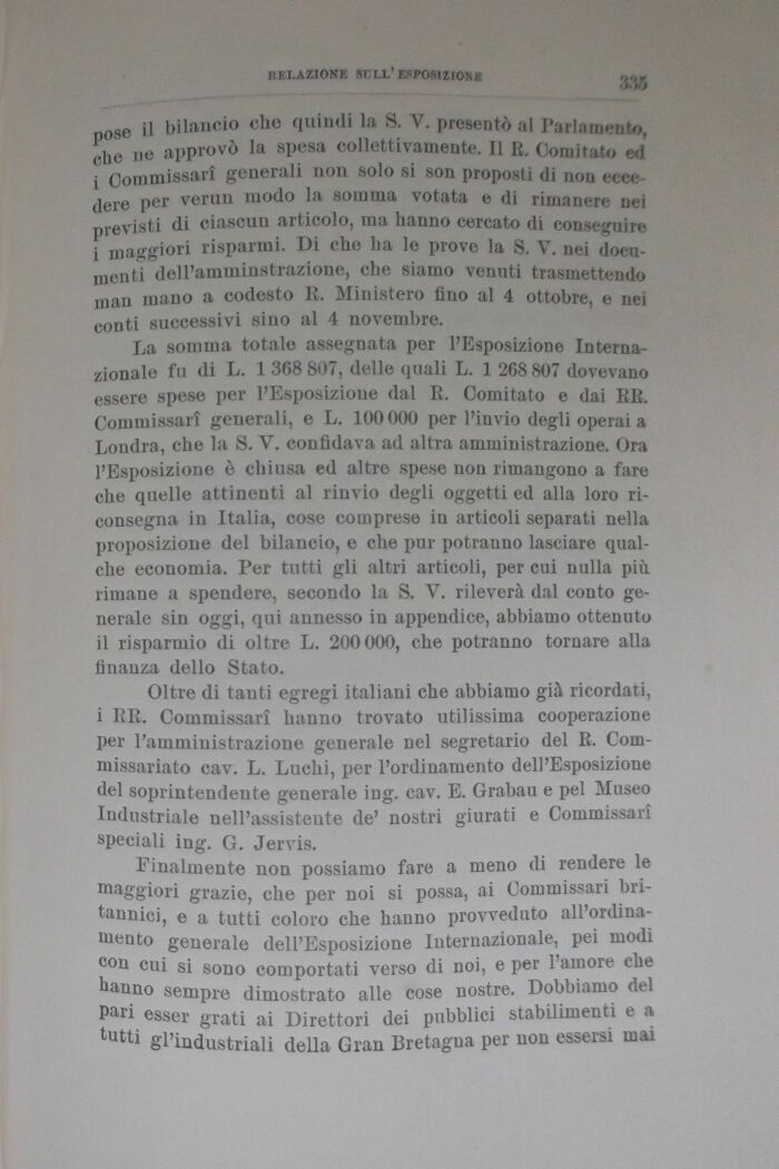 Finalmente non possiamo fare a meno di rendere le maggiori grazie, che per noi si possa, ai Commissari britannici, e a tutti coloro che hanno provveduto all'ordinamento generale dell'Esposizione Internazionale, pei modi cou cui si sono comportati verso di noi, e per l'amore che hanno sempre dimostrato alle cose nostre. Dobbiamo del Pari esser grati ai Direttori dei pubblici stabilimenti e a tutti gl'industriali della Gran Bretagna per non essersi mai